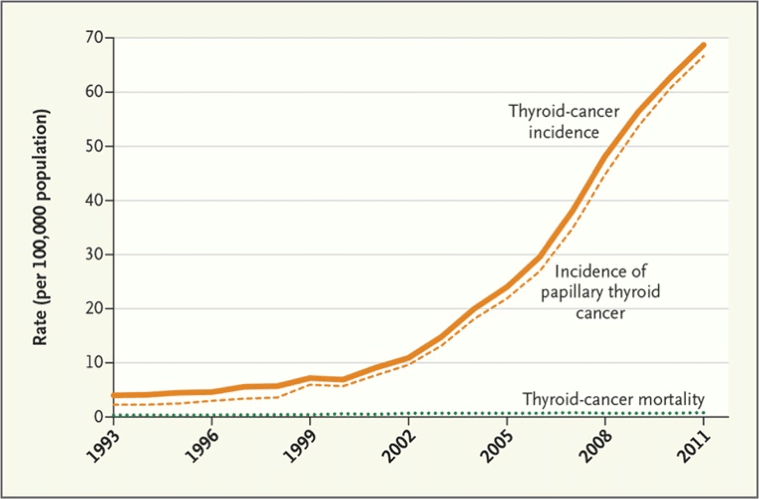 Nothing demonstrates that better than South Korea’s “natural experiment” in thyroid cancer screening. The government decided too many people were dying of it, so they decided to fund ultrasounds for early detection. Here is the predictable result: a massive increase in suspicious “inconclusive” results leading to a massive increase in the number of thyroids removed…and essentially no change in the death rate: